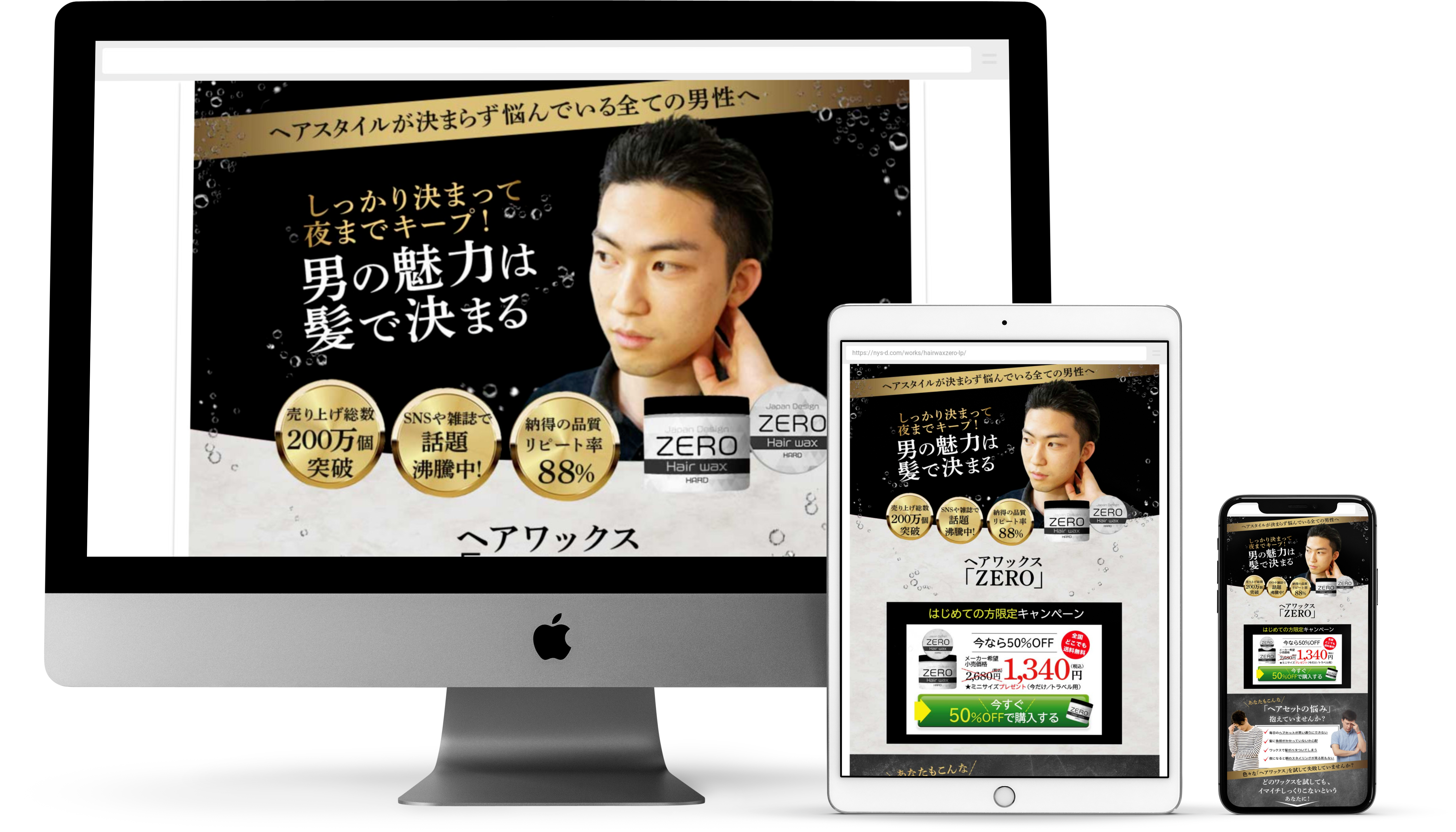 - 20代から30代向けの男性向けのヘアワックスのLPです。 ヘアセットがうまくいかず悩んでいる男性へ、簡単だけどかっこよくきまる!というイメージで黒を基調にクールな雰囲気を打ち出しました。