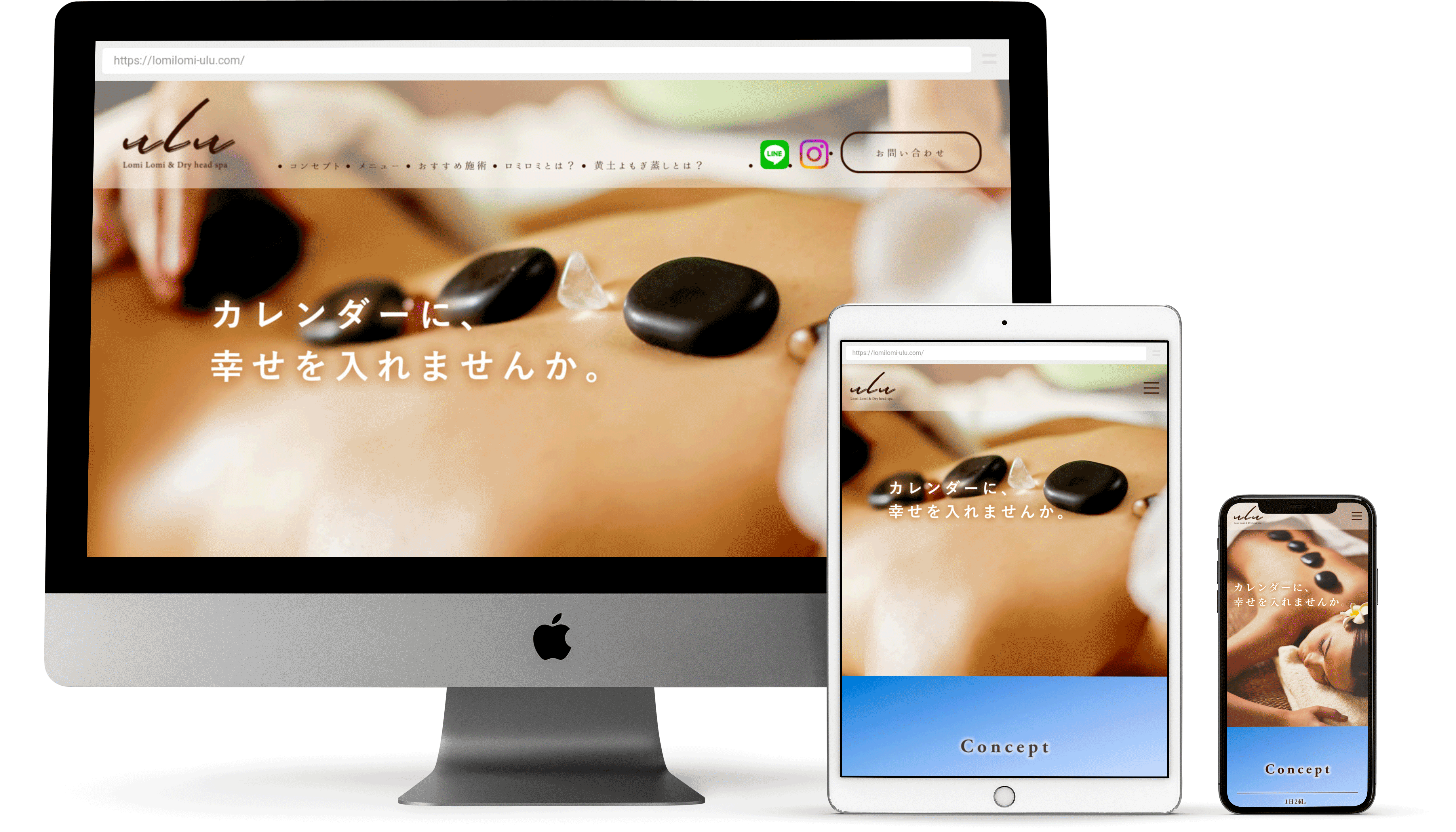 - ハワイアンロミロミという、ハワイ伝統の個性豊かなマッサージ店です。線画でハワイアンを演出しながら、茶系の色使いでサイトを統一し、癒しの雰囲気を作り出しました。